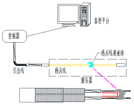 當(dāng)有液體與液冷感應(yīng)線接觸時(shí),液體浸入感應(yīng)線編織層,使兩根感應(yīng)線芯遇液體導(dǎo)通,形成回路,測漏控制器檢測到漏液情況,發(fā)出報(bào)警信號。