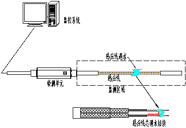 當(dāng)有液體與液冷感應(yīng)線接觸時,液體浸入感應(yīng)線編織層,使兩根感應(yīng)線芯導(dǎo)通,形成回路,檢測模塊檢測到漏液情況,發(fā)出報警信號。
