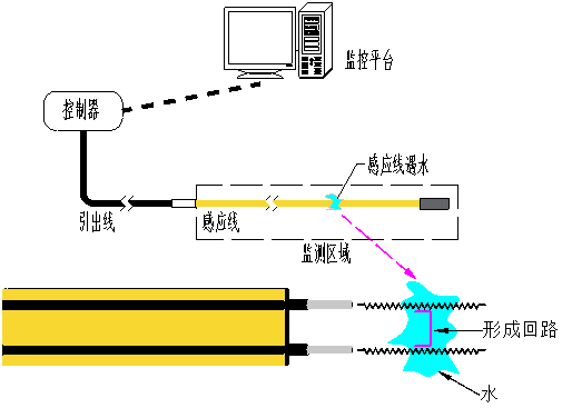 當有液體與感應線接觸時,兩根感應線內芯線遇液體導通,形成回路,測漏控制器檢測到漏液情況,發(fā)出報警信號。