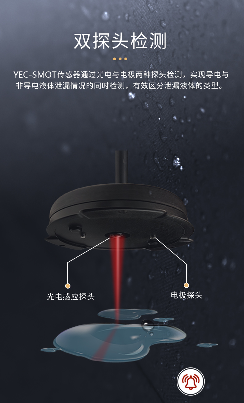 YEC-SMOT 光電泄漏傳感器采用光電探測(cè)與電極探測(cè)兩種檢測(cè)原理,可檢測(cè)并區(qū)分導(dǎo)電液體與非導(dǎo)電液體。結(jié)構(gòu)采用全塑封結(jié)構(gòu)設(shè)計(jì),電子元器件受環(huán)境因素影響小,保證了產(chǎn)品的高精度及可靠性。產(chǎn)品具有靈敏度高,響應(yīng)時(shí)間快,使用方便,便于安裝等特點(diǎn)。傳感器輸出的 485 信號(hào),可與各種監(jiān)控系統(tǒng)相整合,實(shí)現(xiàn)遠(yuǎn)程監(jiān)控。