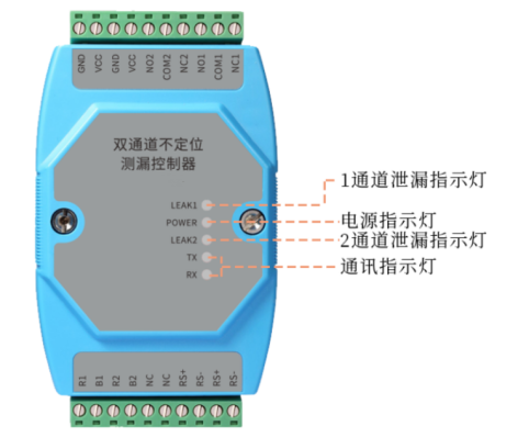 控制器與感應(yīng)線連接,監(jiān)測一塊或兩塊區(qū)域的泄漏情況,通過RS85信號傳輸泄漏情況數(shù)據(jù),上傳至上位機??刂破骼^電器輸出信號可用來控制外圍設(shè)備如聲光報警器、電話撥號器、短信模塊、開關(guān)量采集模塊等。