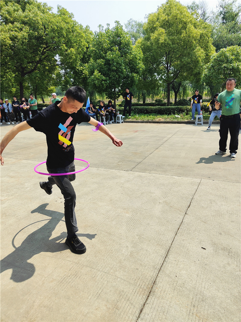 接下來是粘人的呼啦圈比賽,這是一項需要默契和配合的活動。需要將呼啦圈保持掛在身上,行走到終點換其他隊員,按照這樣的要求依次走完,行走過程中不可以用手觸碰呼啦圈,呼啦圈也不可以落地,中途呼啦圈落地可原地撿起繼續(xù)行走,使用的時間最短的隊伍分數越高。