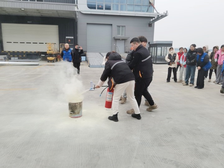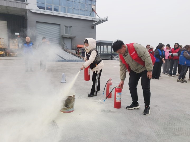 疏散演練結(jié)束后,滅火器的正確使用培訓(xùn)成為重頭戲。在各倉(cāng)的演練現(xiàn)場(chǎng),指導(dǎo)員潘宏浩詳細(xì)講解了滅火器操作要領(lǐng)。面對(duì)熊熊燃燒的模擬火盆,員工們躍躍欲試,紛紛拿起滅火器,按照 “一提、二拔、三握、四壓” 的口訣,對(duì)準(zhǔn)火焰根部進(jìn)行噴射操作。