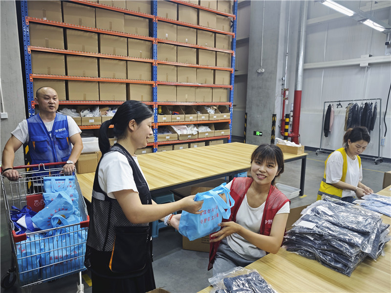 活動(dòng)當(dāng)天,寶時(shí)云倉(cāng)人事行政部主管陳文娣和各倉(cāng)經(jīng)理手持清涼禮包,穿梭在多個(gè)倉(cāng)庫(kù)的工位之間,將精心準(zhǔn)備的防暑清涼禮包送到每一位員工手中。